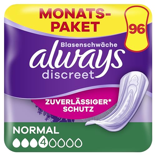 Always Discreet Inkontinenzeinlagen Normal, 96 Binden (4 x 24 Stück) Monatspaket, diskreter Schutz & hohe Saugstärke, geruchsneutralisierend (Verpackung kann variieren)