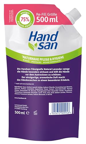 Praktischer Nachfüllbeutel: Die Flüssigseife entspricht der naturnahen sowie hygienischen Pflege von Handsan, ist frei von tierischen Inhaltsstoffen und im 500 ml Nachfüllbeutel perfekt zum einfachen Nachfüllen geeignet.