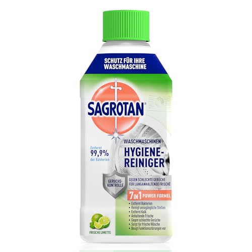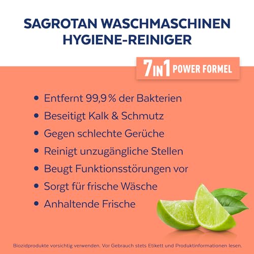 Sagrotan Waschmaschinen Hygiene-Reiniger Frische Limette. Enthält Alkyl(C12-C16)benzyldimethylammoniumchlorid, L(+)-Milchsäure, Zitronen-